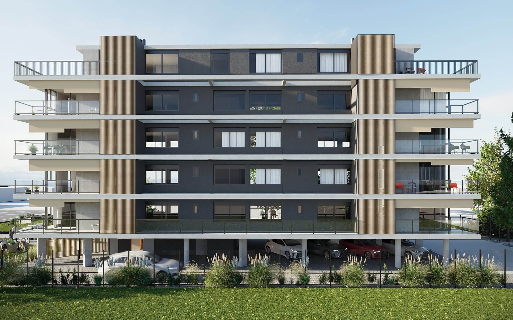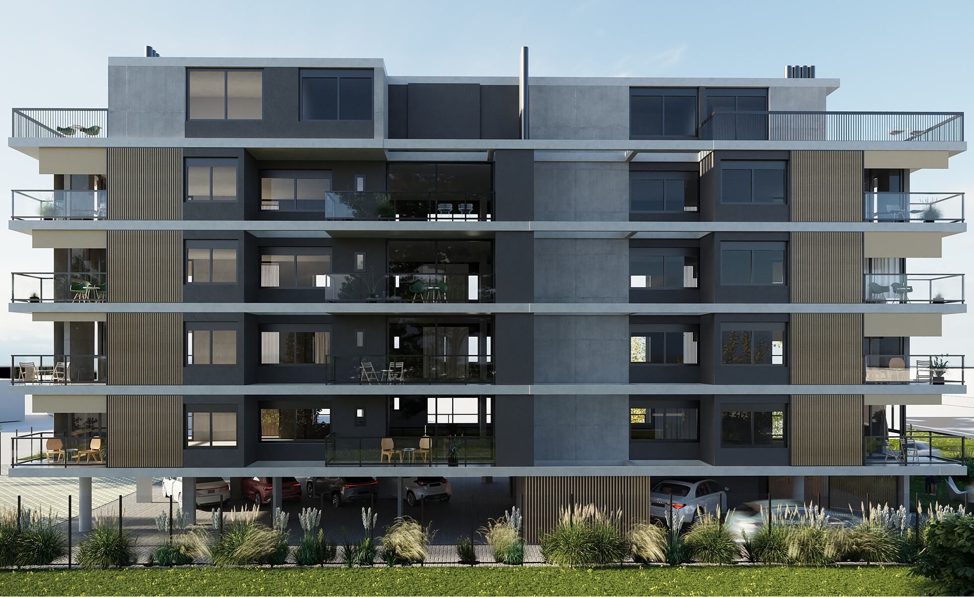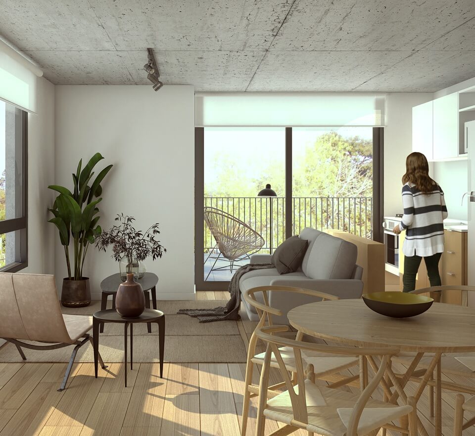 Está presente el diálogo con la naturaleza, con amplias terrazas y espacios luminosos. El proyecto cuenta con 5 pisos y 23 unidades de 1 o 2 dormitorios.