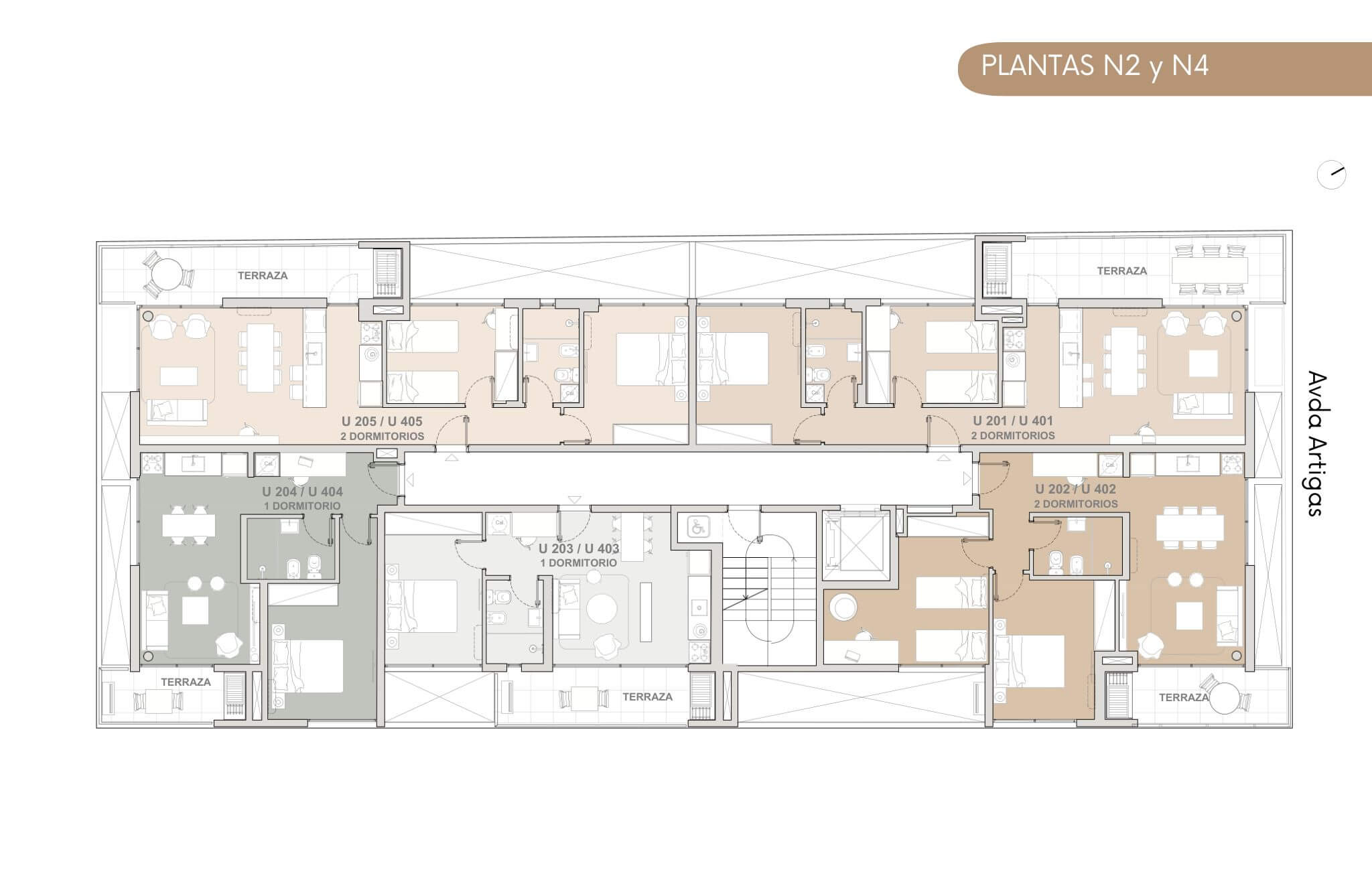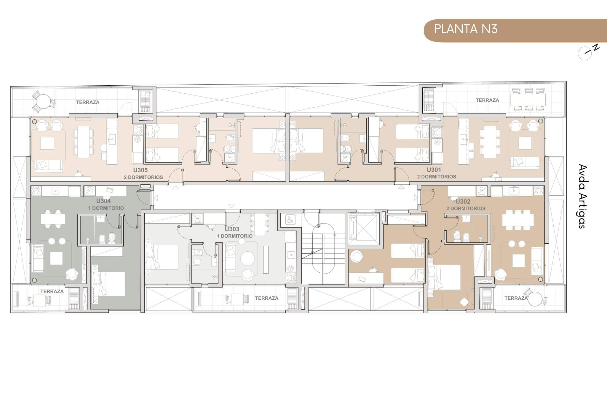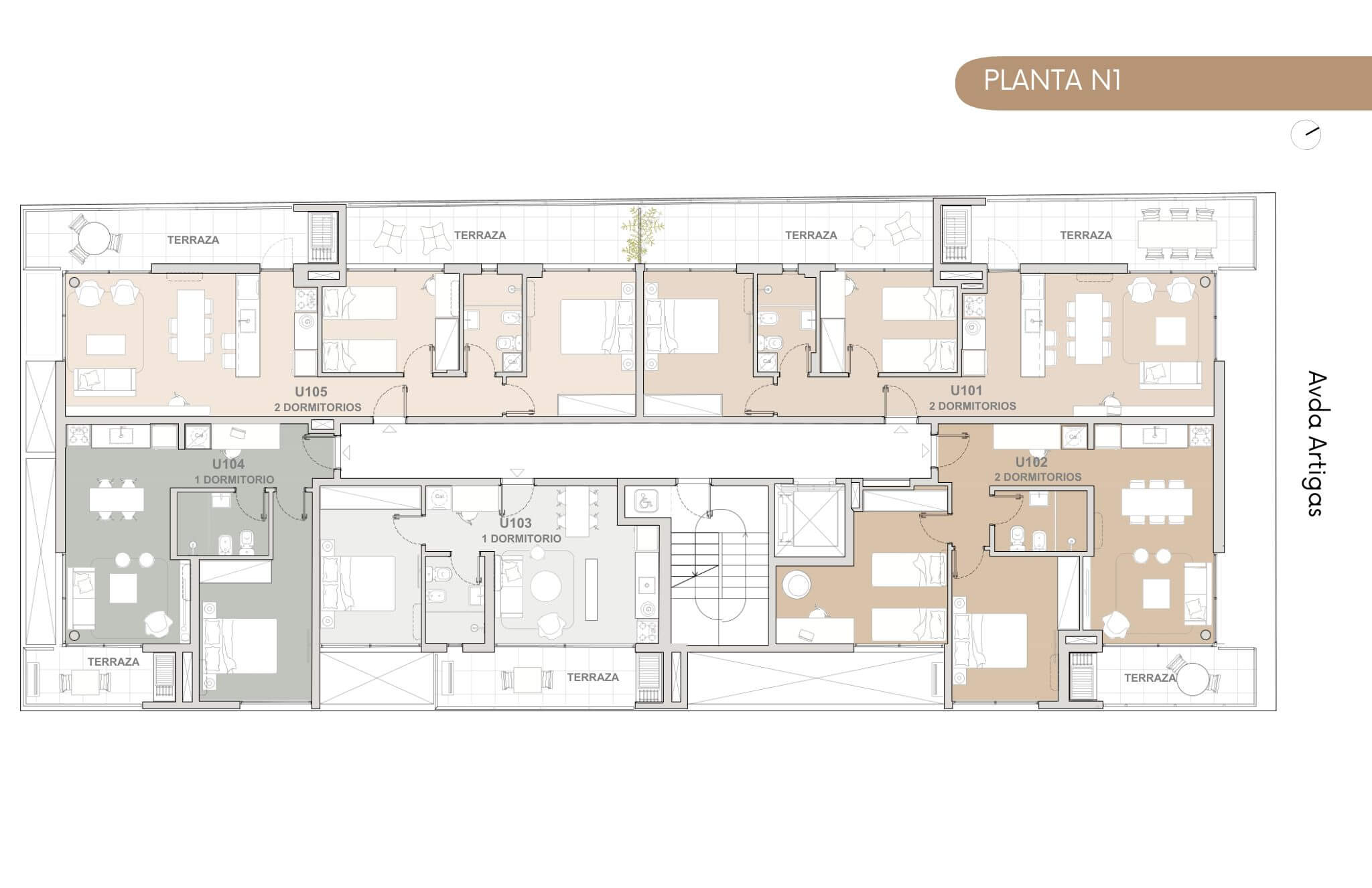 Está presente el diálogo con la naturaleza, con amplias terrazas y espacios luminosos. El proyecto cuenta con 5 pisos y 23 unidades de 1 o 2 dormitorios.